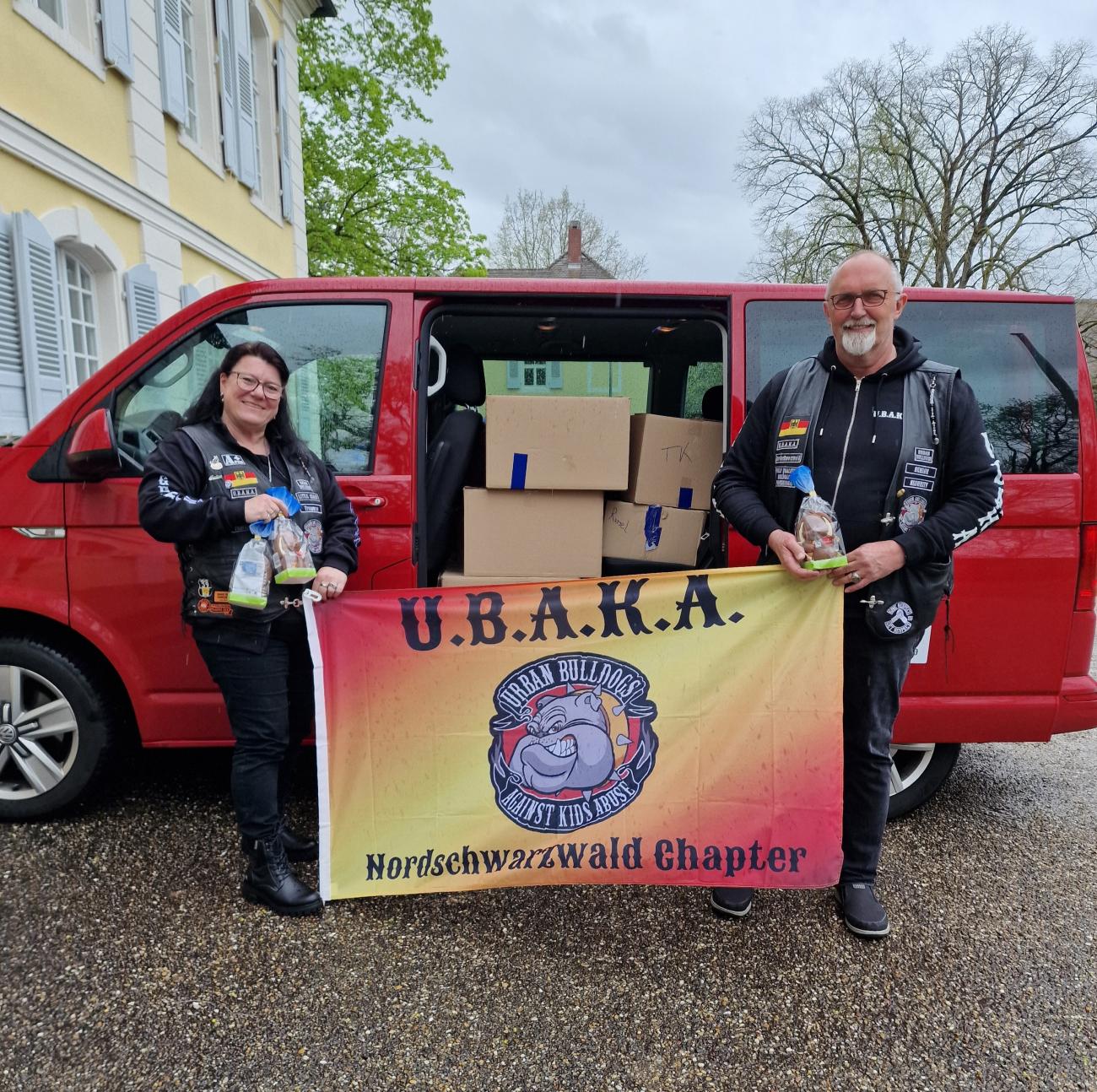 Die gemeinnützige Organisation "Urban Bulldogs Against Kids Abuse (U.B.A.K.A.)" Nordschwarzwald Chapter machte im vergangenen Jahr bei ihrer jährlichen Motorradausfahrt einen Zwischenstopp bei uns in der Jugendeinrichtung und hat uns so gut in Erinnerung behalten, dass sie ganz hellhörig wurden, als ihnen folgende Chance geboten wurde: Eine Schokoladenspende von knapp 700 Schokohasen und Ostereiern durfte an Kinder verteilt werden. Deshalb haben sie ausnahmsweise und aufgrund der Wetterlage ihr Auto und nicht ihre Motorräder mit Kartons beladen, um bei uns in der Jugendeinrichtung für strahlende Kinderaugen zu sorgen.