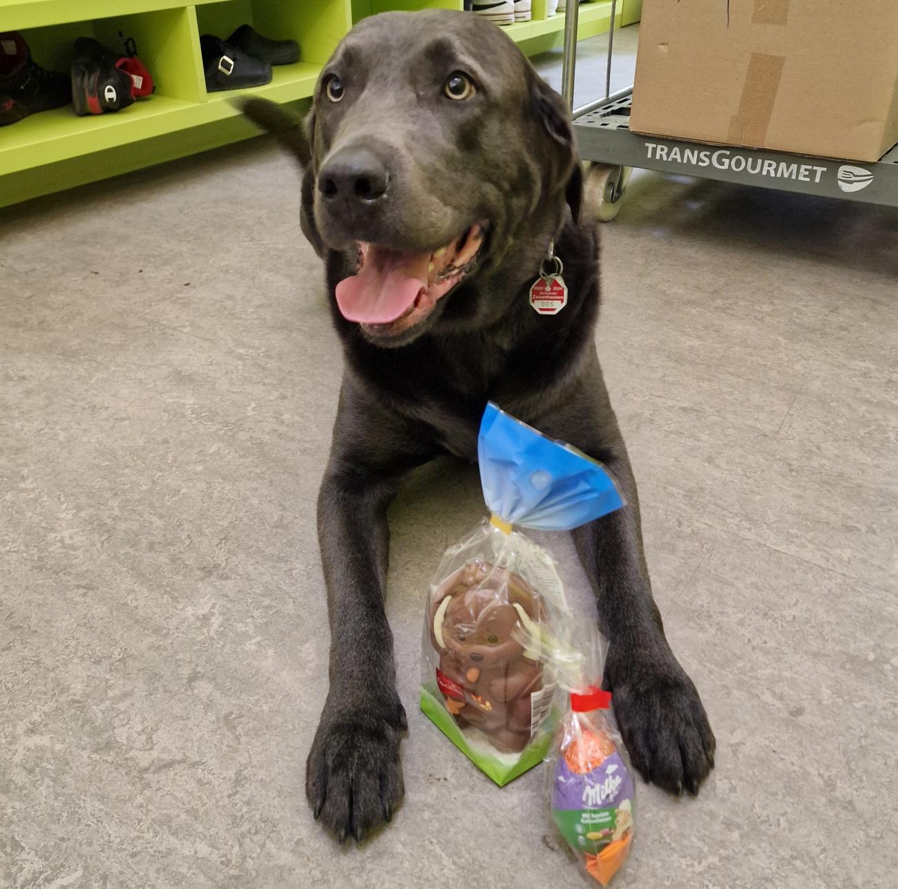 Sobald alle Kinder wieder von ihren Osterferien zu uns zurückgekehrt sind, wurde die süße Spende mit tierischer Unterstützung auch fleißig verteil.